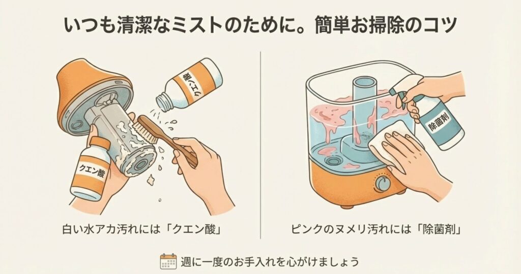 綺麗なミストを吸い込むためにも、ここはちょっとだけ頑張りましょうね。自分を労わるのと同じくらい、家電も可愛がってあげてください。