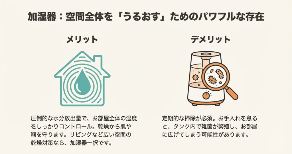 加湿器の最大のメリットは、なんといっても圧倒的な水分放出量です。お部屋全体の湿度をしっかりコントロールして、乾燥から私たちを守ってくれる頼もしい存在なんですよ。