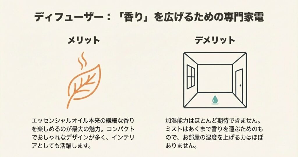 アロマディフューザーは、お部屋を「潤す」のではなく「香りを広げる」ための専用家電です。
