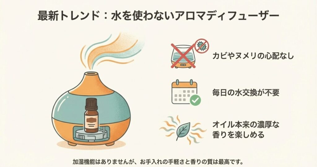 もちろん、水を使わないので加湿機能はゼロですが、その分「香り」に特化したストレートな癒やしが得られます。