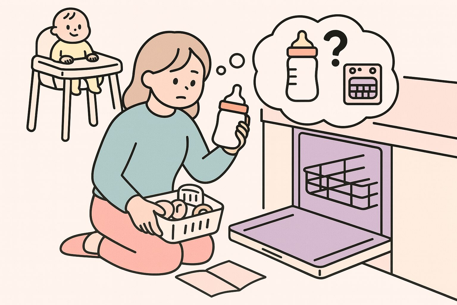 特に新生児期は授乳間隔も短く、ミルク作りと洗い物に追われる日々が続きます。そんな忙しい育児の中で、食洗機を使って哺乳瓶を洗ってもいいのか気になっている方も多いのではないでしょうか?