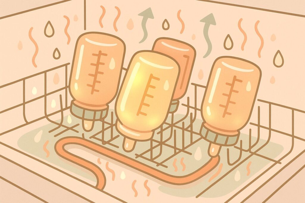 これについては、「哺乳瓶の耐熱温度次第」というのが答えになります。先述のように、PPSU製などの哺乳瓶は耐熱温度が180℃以上と高いものが多く、基本的には食洗機の乾燥機能の熱(通常は80℃~100℃程度)には耐えられます。