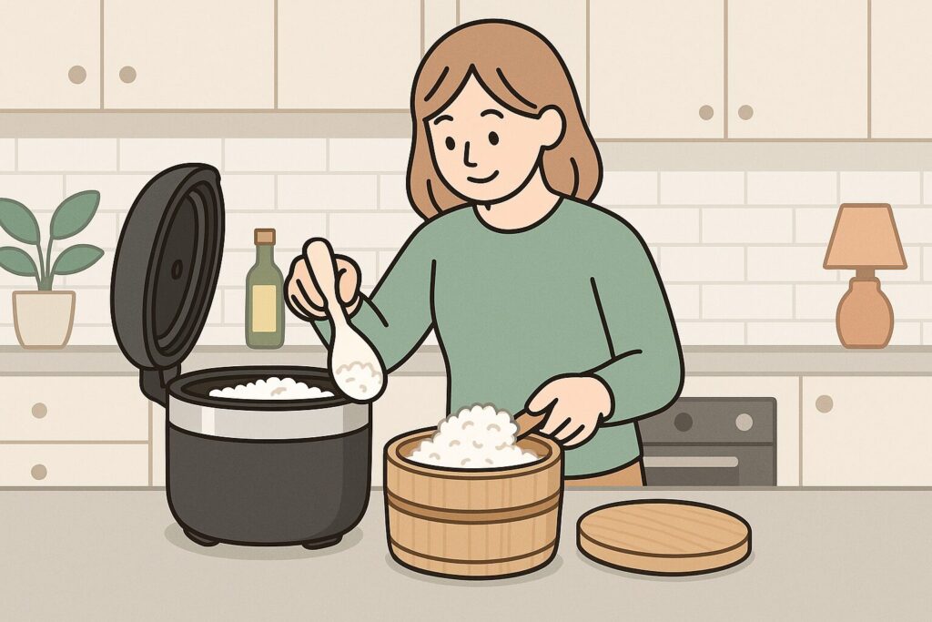 一番多い対処法は、やはり「炊き上がったら、すぐにおひつに移す」という方法です。おひつが余分な水分を吸ってくれるので、しゃっきり感が保たれて美味しく保存できるんです。