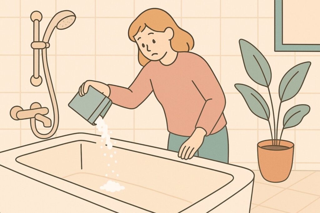 ・柔らかい素材(FRP浴槽など):重曹には研磨作用があるので、強くこすると傷がつくことがあります。優しく使いましょう。