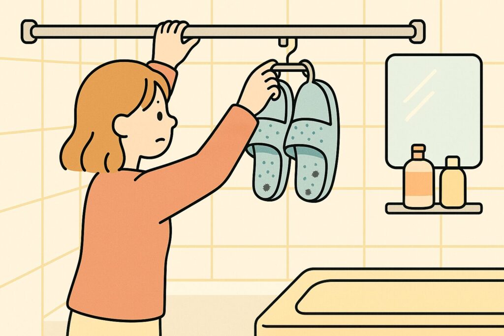 お風呂スリッパを乾かす場所としても使えます。専用フックがなくても、突っ張り棒に引っ掛けておくだけで、水切れが良くなりますよ。