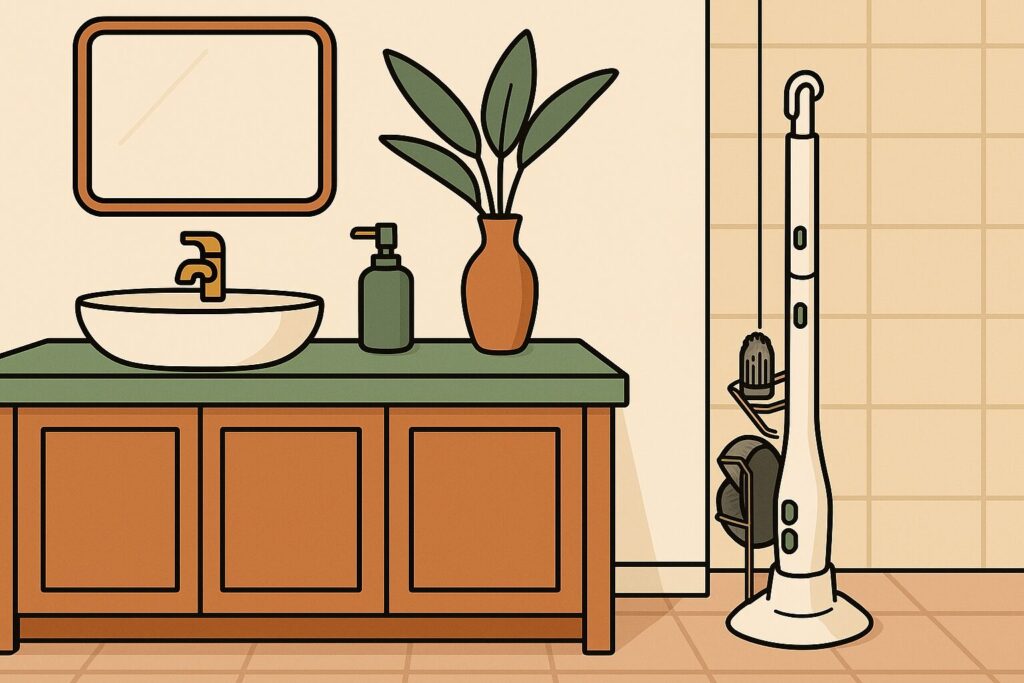 そこで大切なのが、マグネットやフックを使った浮かせる収納で通気性を確保すること、そして浴室乾燥機やサーキュレーターといった家電の力で強制的に乾燥させること。さらに電動バスポリッシャーを導入すれば、収納に悩む掃除用具自体の数を減らすことも可能なんです。
