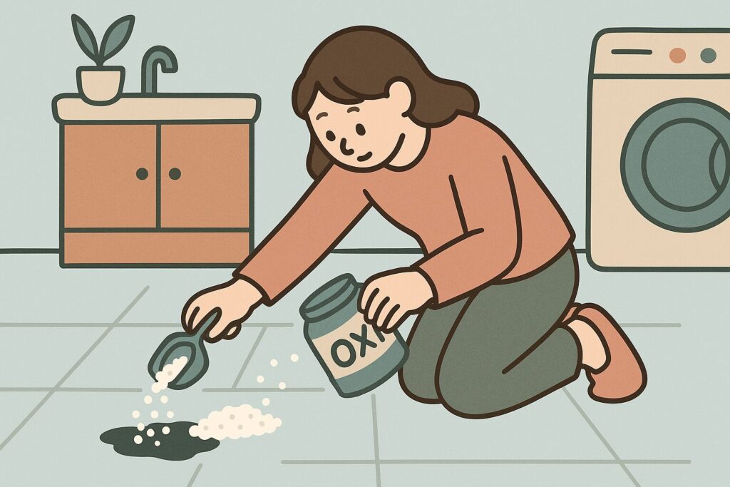 薄めたオキシクリーン液をクロスに含ませ、黒ずみ部分にだけ置くようにして数分おき、そのあと水拭きでしっかり拭き取ります。床全体をオキシクリーンでびしょびしょにするのではなく、あくまでスポット的に使うイメージです。