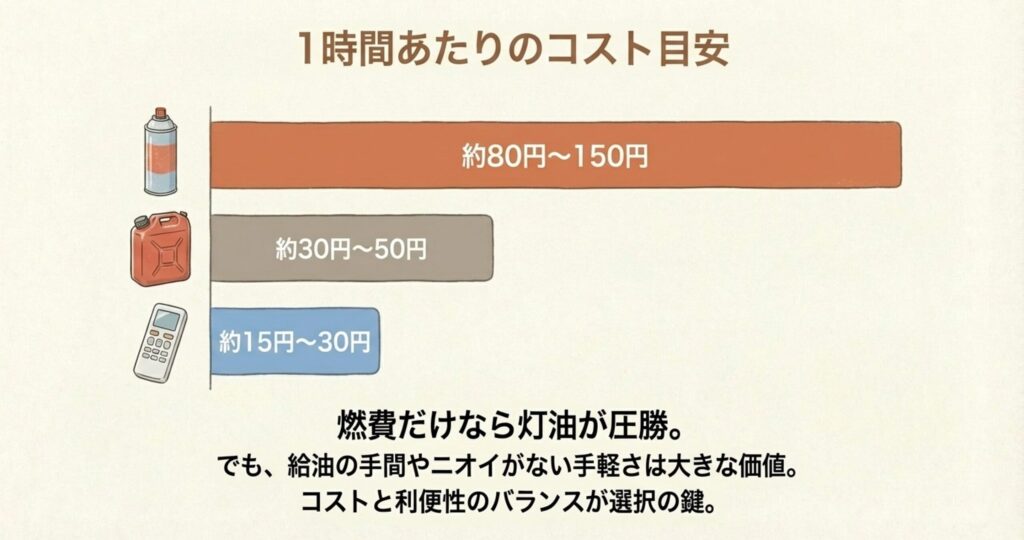 灯油は18リットルで2,000円前後(地域や時期によりますが)で、1時間あたりのコストは約30円程度。対してカセットガスは、1本当たり200円から300円。