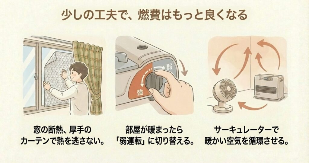 窓に断熱シートを貼ったり、厚手のカーテンを閉めたりするだけで、ストーブの設定を「弱」にしても十分暖かさを保てます。