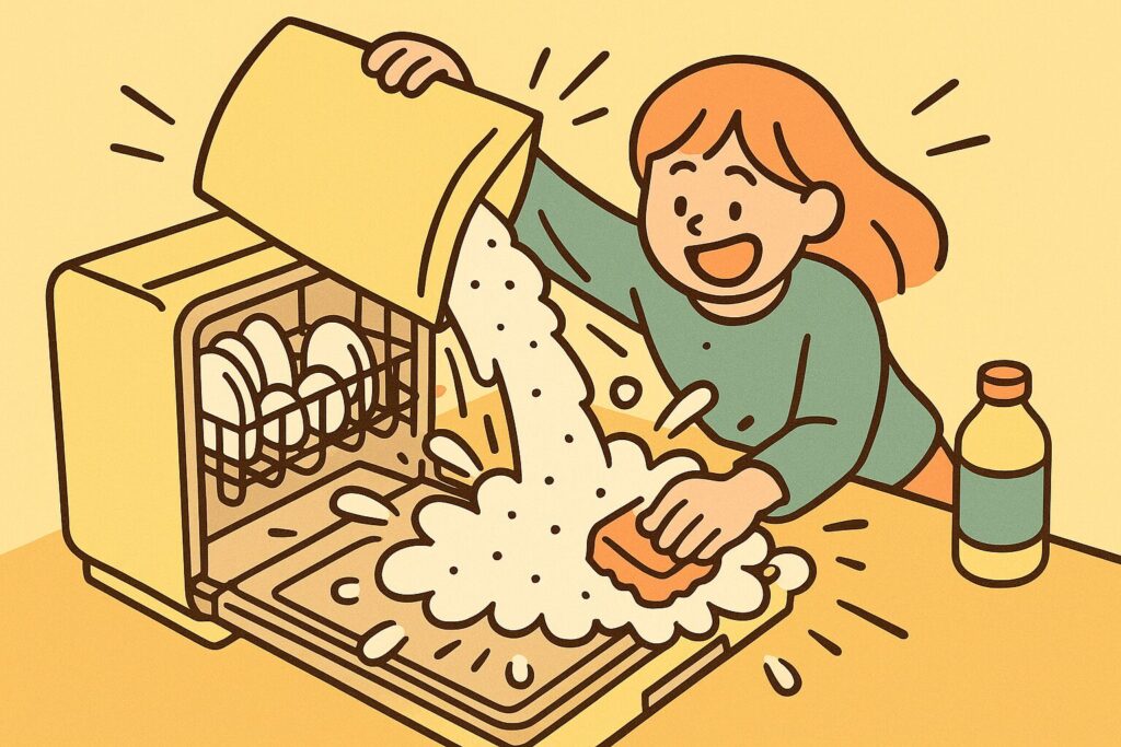 また、たとえ緊急時でも食器用の中性洗剤(手洗い用)で代用するのもNGです。庫内が泡だらけになって、水漏れや故障の原因になりますから注意してくださいね!
