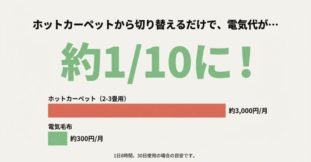 ズバリ言います。電気毛布の省エネ性能は、他の暖房器具とは比べ物にならないレベルです。