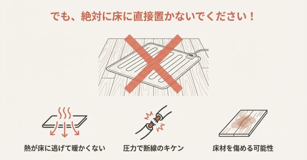 これをやると、電気毛布の熱が冷たい床に全部吸い取られてしまって、「全然暖かくない!壊れてるの?」ってなっちゃいます。それどころか、床材が熱で変色したり、滑って転んだりするリスクもあるんです。