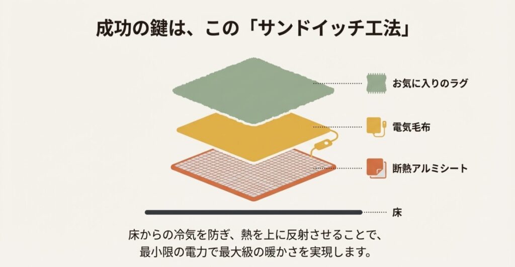 私がおすすめしているのは、電気毛布を他のアイテムで挟み込む「サンドイッチ工法」です。
