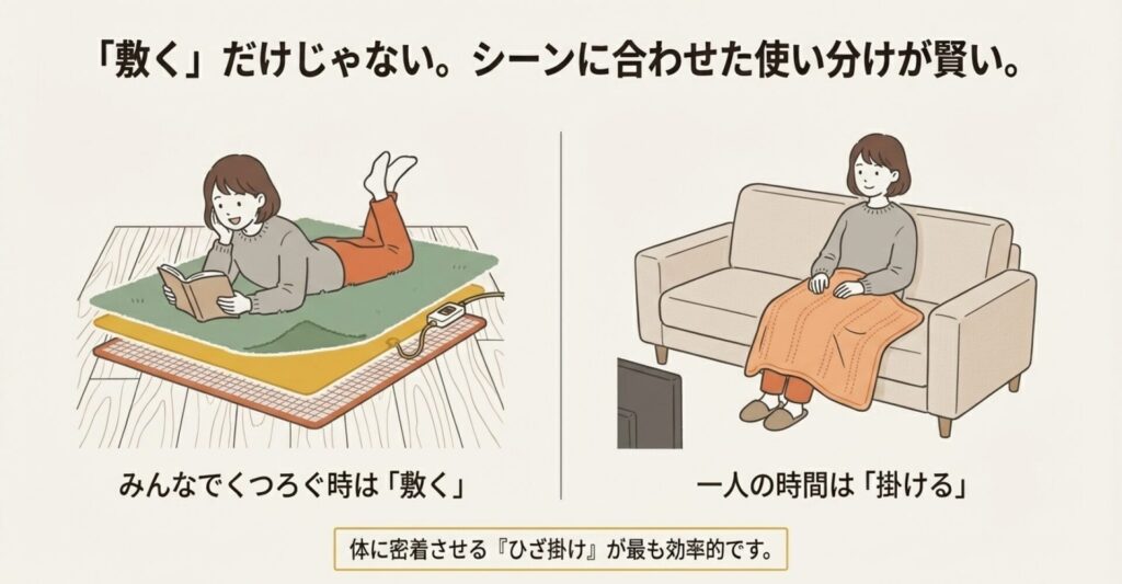 敷き・掛けのメリットと使い分けをもっと具体的に知りたい場合は、電気毛布は掛けと敷きどっちがいいかの違いと正しい使い分けも参考になります。