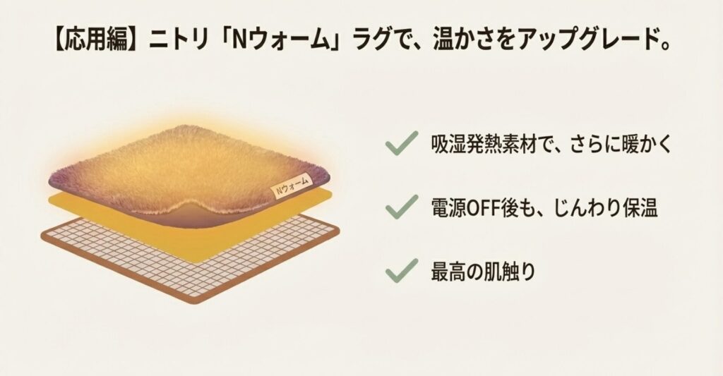 実は、このNウォームのラグを、電気毛布の上に敷く「トップカバー」として使うのが、個人的には最強の組み合わせだと思っています。Nウォームが熱を逃がさないので、電気毛布の電源を切った後もしばらく暖かいんですよ。