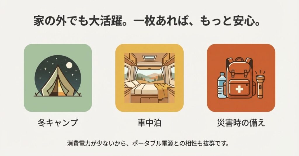さらに最近では、ポータブル電源と組み合わせて「冬キャンプ」や「車中泊」で使う方もすごく増えています。消費電力が少ない電気毛布なら、小型のポータブル電源でも一晩中稼働させられますからね。災害時の備えとしても、一枚持っておくと本当に安心です。