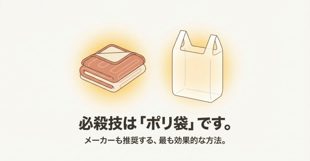 電気毛布を折りたたんで、そのポリ袋に入れます。そして、ここがポイント!その袋を敷き布団と掛け布団の間、もしくはマットレスの上に挟み込むようにセットします。上下を布団で挟むことで、断熱効果を高めるんです。