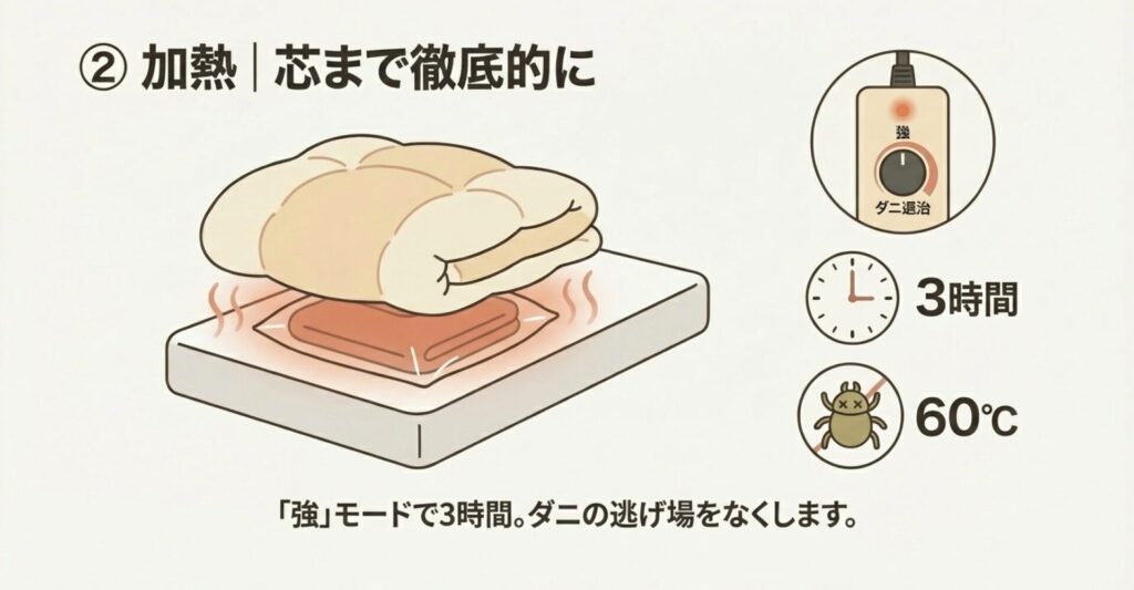 なぜ3時間も必要なのかというと、布団やマットレスって、実はすごく断熱性が高いからなんです。表面が熱くなっても、ダニが潜んでいる深部まで熱が伝わるには時間がかかります。じっくりじっくり熱を浸透させて、芯までアツアツにするために必要な時間が3時間というわけです。