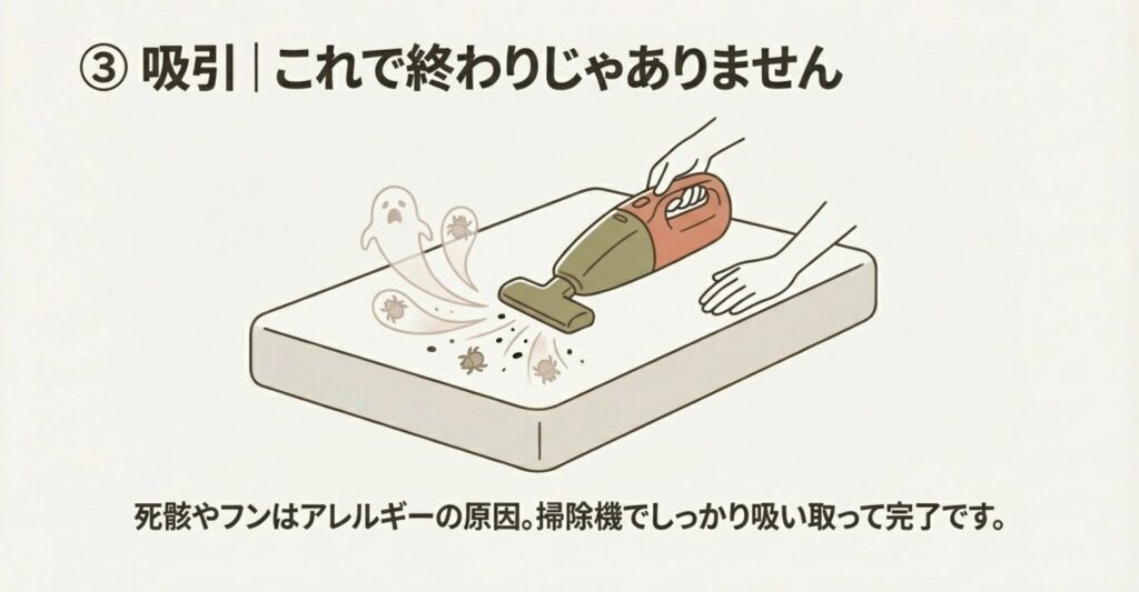 2. 除去 終わったら必ず掃除機がけ。死骸やフンを吸い取ってアレルギー予防。