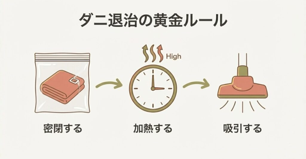 そこで私が一番効果的だと断言するのが、後ほど詳しく解説する「密閉法」です。熱を閉じ込めて、ダニの逃げ場を完全になくす。これが鉄則です。