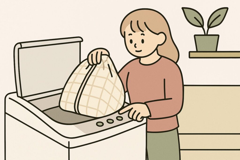 必ず「毛布洗い用の大きな洗濯ネット」に入れてください。一番大きい筒型や角型のネットがおすすめです。そのまま放り込むと、生地が擦り切れたり、プラグが洗濯槽に激突して破損します。