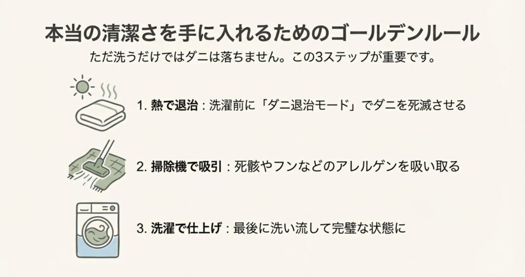 • 熱と洗濯を組み合わせた最強のダニ対策