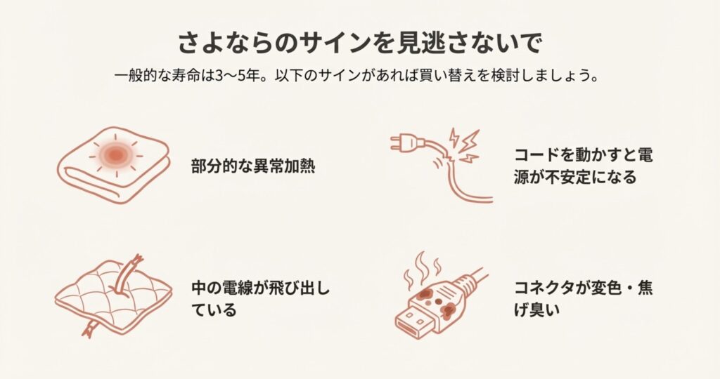 目に見えない中のヒーター線がボロボロになっていると、最悪の場合、火災につながることもあるから。
