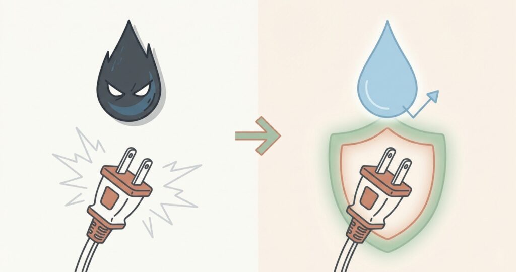 表面は乾いているように見えても、差し込み口の奥に水分が残っていると、通電した瞬間にショートする危険があります。コネクタ部分を下に向けて干し、水気が完全に抜けるようにしてください。