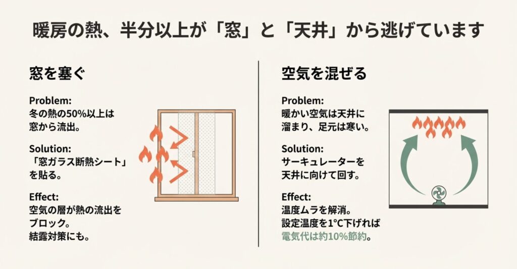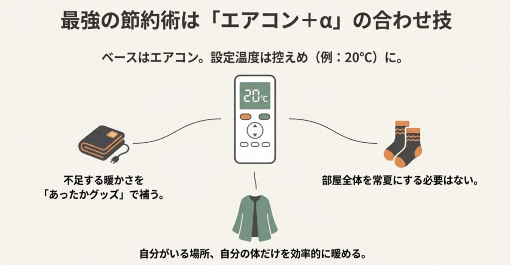私のイチオシ戦略は、「エアコンをベースロード電源のように使い、足りない部分を局所暖房や断熱グッズで補う」という多層的なアプローチです。