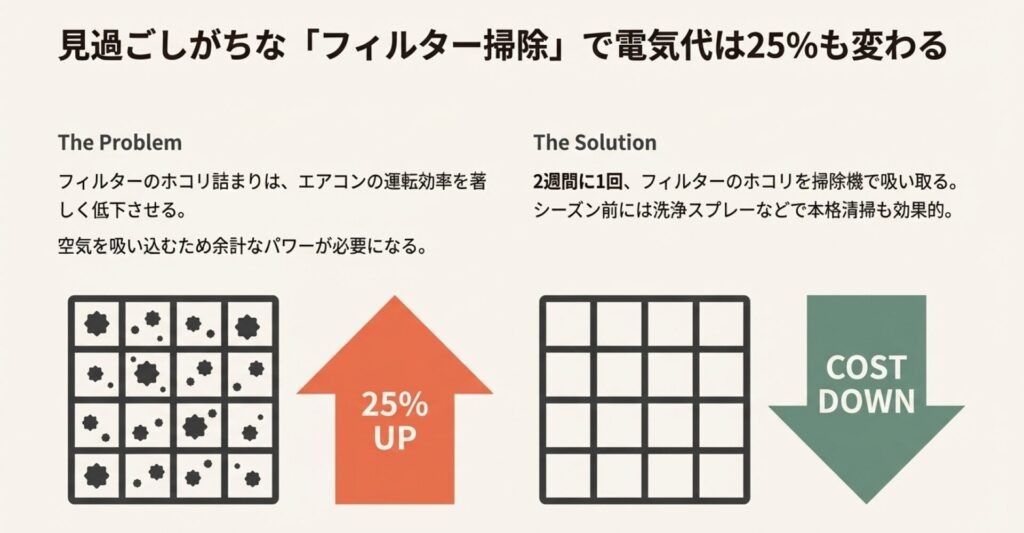 フィルターが埃で詰まっていると、エアコンは空気を吸い込むのに余計なパワーを使うことになり、効率がガタ落ちします。最悪の場合、電気代が25%も余計にかかるなんてデータもあるんです。2週間に1回はフィルター掃除機をかけましょう。