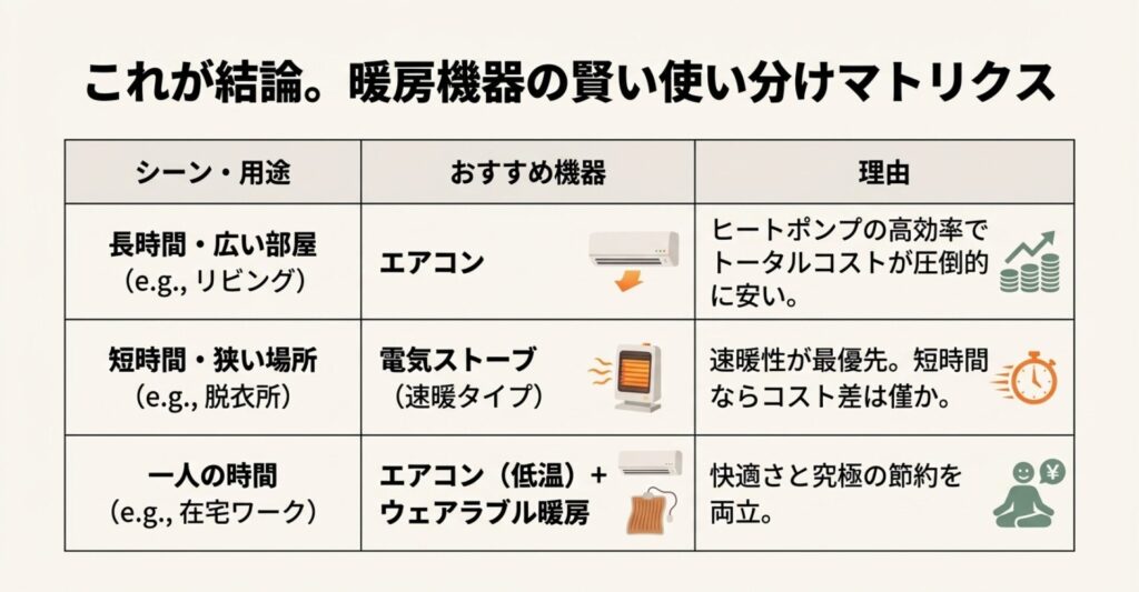 結局、どっちが安いの?という問いへの答えは、「状況によるけど、基本はエアコン!」です。
