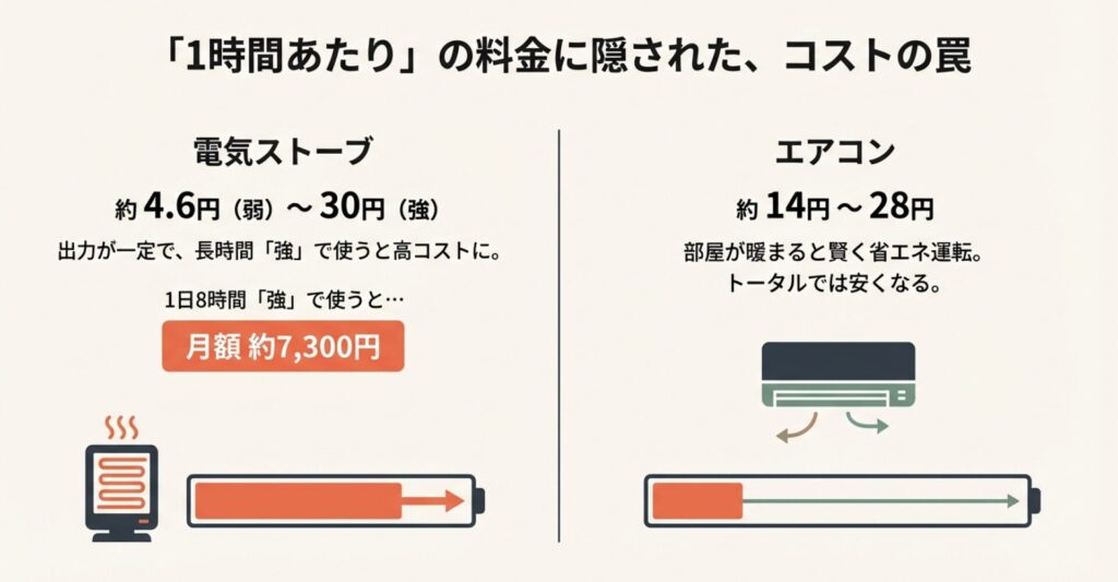 電気ストーブは出力固定で電気を食い続けるのに対し、エアコンは賢く出力を調整します。長時間使うなら、断然エアコンがお財布に優しいんです。