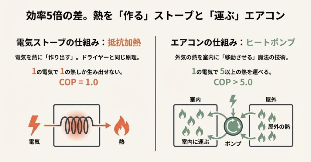 COP(成績係数)という数値があるんですが、電気ストーブは理論上「1.0」が限界。でも最新エアコンは「5.0」を超えます。同じ1000円分の電気を使っても、得られる暖かさが5倍違うって考えるとすごくないですか?