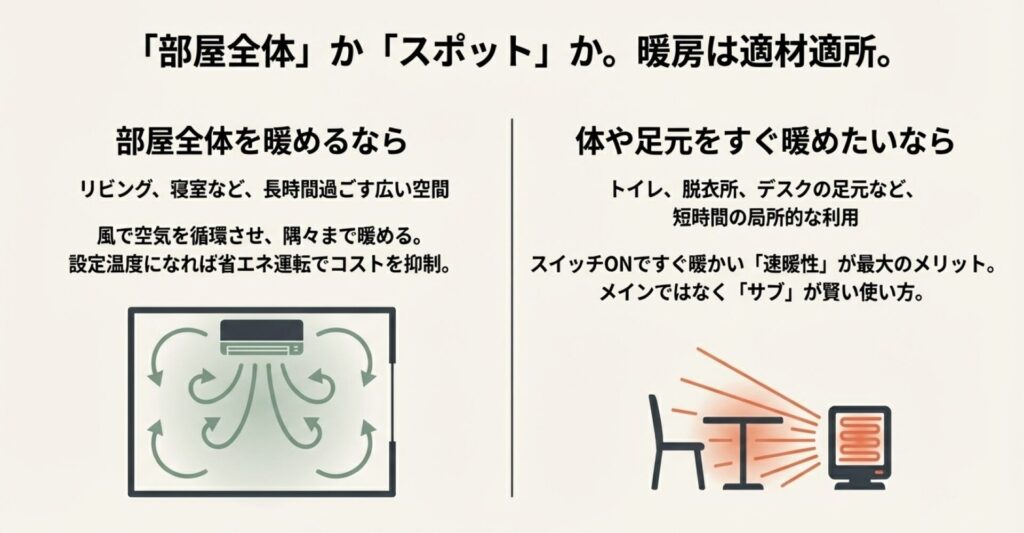トイレや脱衣所、キッチンの足元など、長時間いない場所や、エアコンが効くまでの「つなぎ」として使うのが賢い方法。メイン暖房ではなく、あくまで「サブ」として割り切って使うのがポイントです。