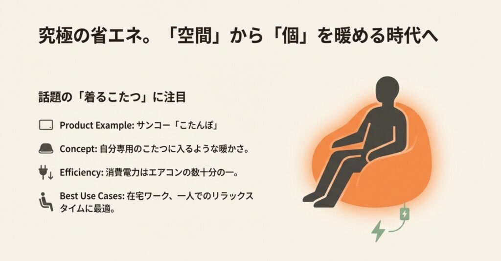 部屋全体を暖めるのではなく、自分自身を直接暖めちゃおうという発想。これが究極の省エネなんです。