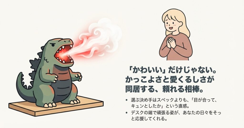 最新の「加湿王バーニングゴジラ【改】」は、口から赤い光と共にド派手な放射熱線ミストを吐き出すんです。かっこいいけど、どこか愛くるしい、そんなデザインが男女問わず人気です。