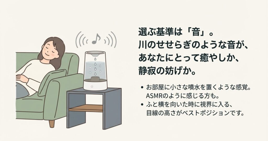 この機能を持つモデルを選ぶとき、一番大切にしてほしいのは「音の感じ方」なんです。水が常に循環しているので、かすかに「チョロチョロ」という川のせせらぎのような音がします。