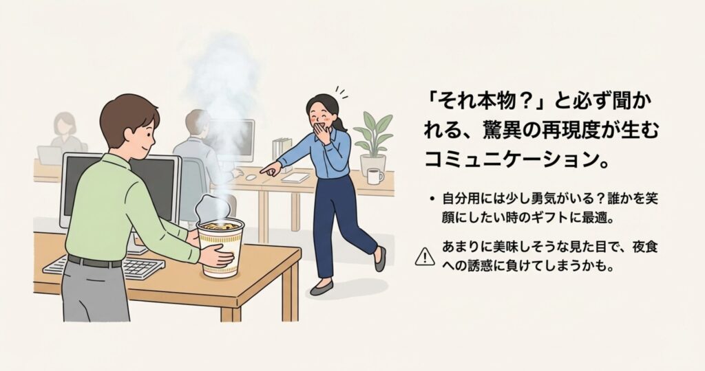 ロゴから成分表、蓋のめくれ具合まであのカップヌードルそのもの。そこから湯気に見立てたミストが出ている様子は、シュールすぎて笑うしかありません。