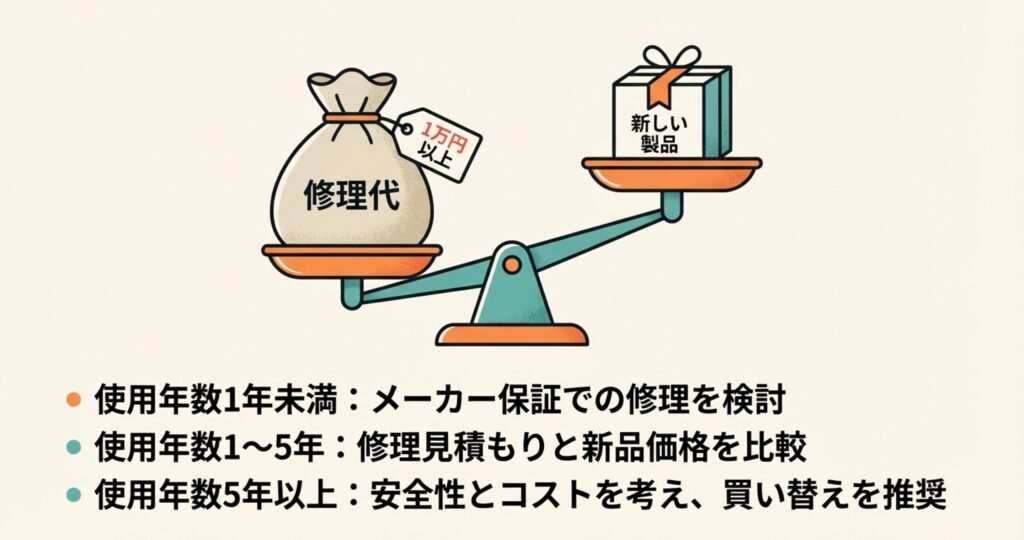 心当たりがある場合は、修理よりも買い替えを検討するタイミングかもしれません。