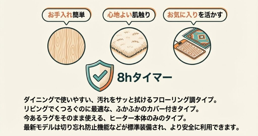 どうしても使うなら、タイマーを短くセットするか、厚手のラグをさらに重ねて、直接熱が伝わりすぎない工夫をしてくださいね。安全に、心地よく使うのが一番ですから。