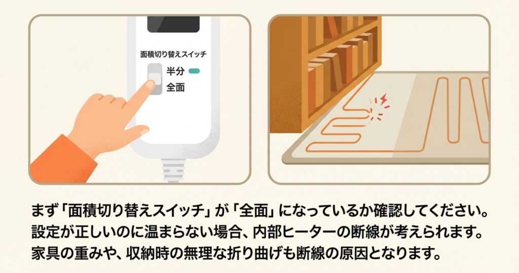 もし、ちゃんと「全面」になっているのに温まらない場合は、残念ながら内部のヒーター線が断線している可能性があります。ホットカーペットは繊細な配線が中を通っているので、強く折り曲げたり、重い家具をずっと載せていたりすると、そこから断線しちゃうんです。
