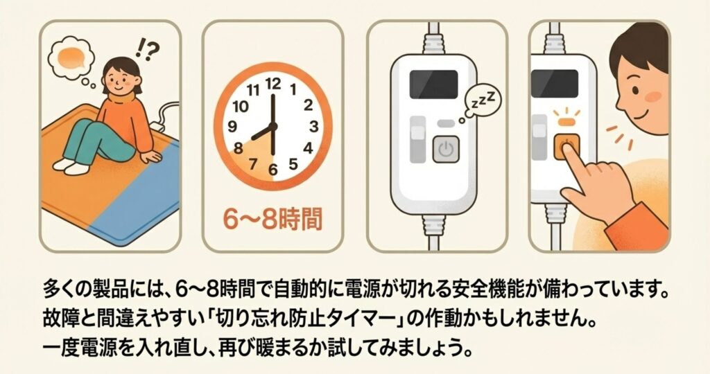もし使用中に急に冷たくなったら、一度電源ボタンを確認してみてください。ランプが消えていたら、タイマーが働いただけかもしれません。