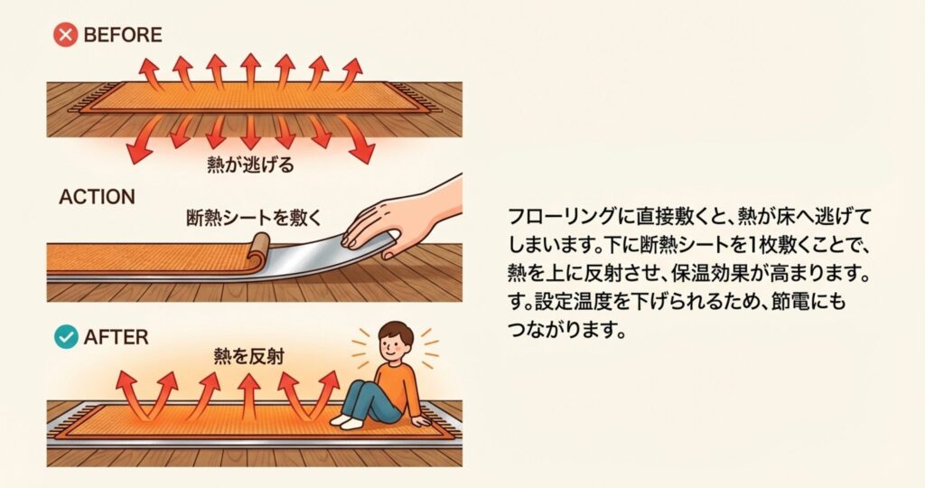 断熱シートや下敷きの素材選びで迷ったら、ホットカーペットの下に敷くものの正解と選び方で具体例を確認してみてください。