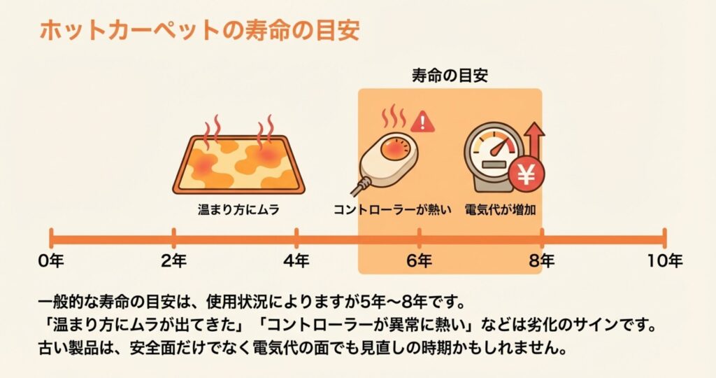 ホットカーペットの寿命は、一般的に5年から8年くらいと言われています。もちろん、すごく丁寧に扱えばもっと長く持つこともありますが、電気部品の劣化は避けられません。