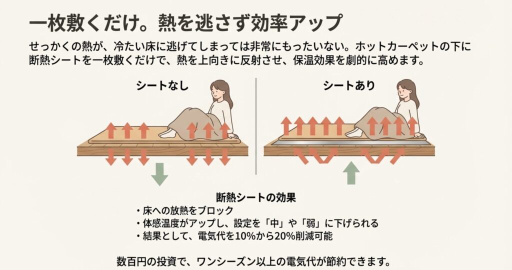 実際に断熱シートを敷くと、今まで「強」じゃないと物足りなかったのが「中」や「弱」でも十分に温かく感じるようになります。結果として設定を下げられるので、電気代を10%から20%削減できるというデータもあるんですよ。