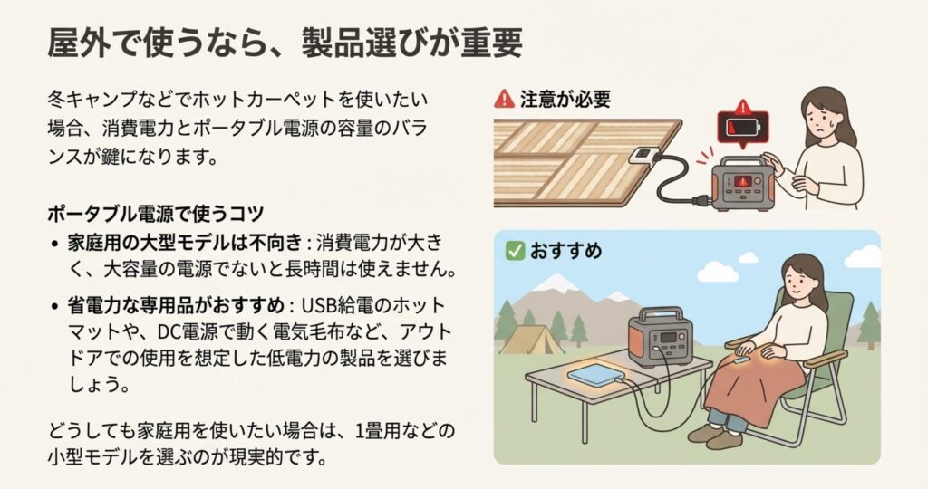 最近はキャンプブームで、冬のキャンプや車中泊でホットカーペットを使いたいという相談も増えています。ここで重要になるのが、ポータブル電源の容量とカーペットのワット数の関係です。
