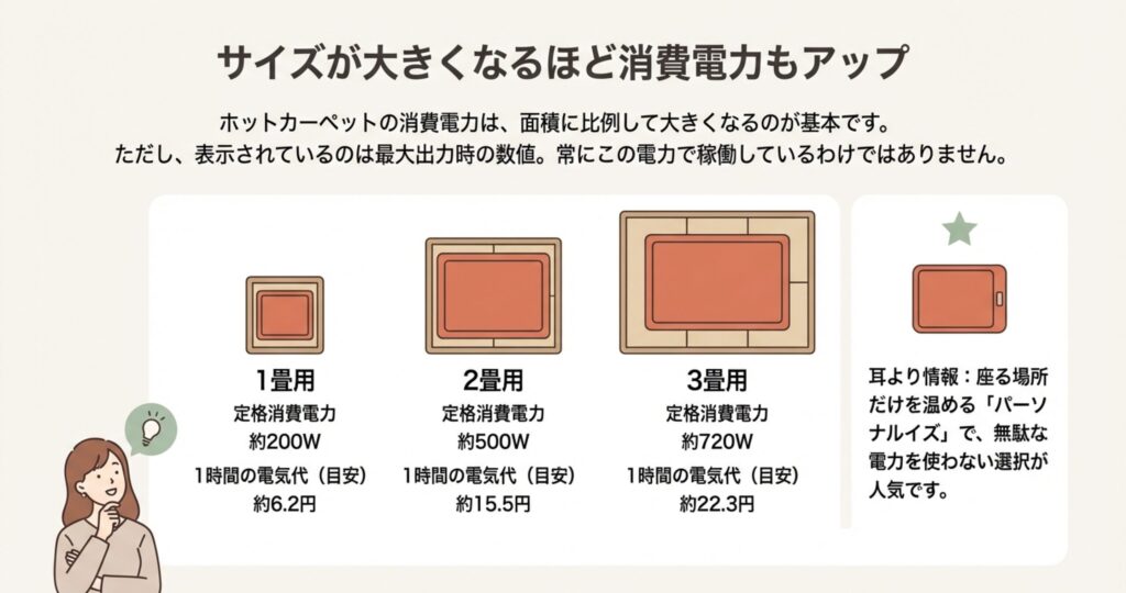 ホットカーペットのワット数は、基本的には面積に比例して大きくなります。