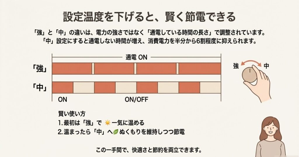 私がお客さまにおすすめしているのは、最初は「強」で一気に温めて、温まったらすぐに「中」や「弱」に落とす方法です。これだけで、ぬくもりを維持しつつ電気代だけを賢くカットできちゃいますよ。