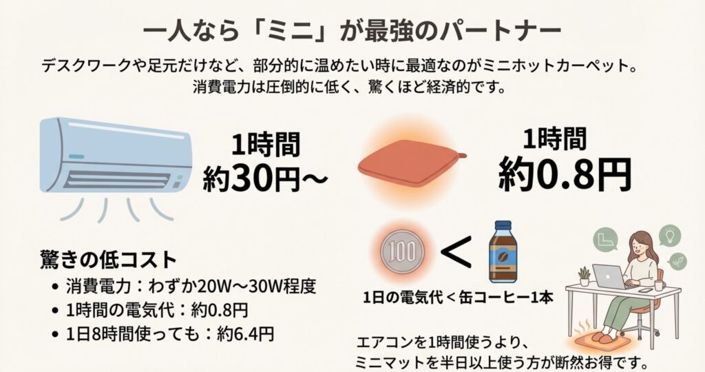 | ミニマット | 20W~50W | 約0.6円~1.5円 | デスクワークの足元に |