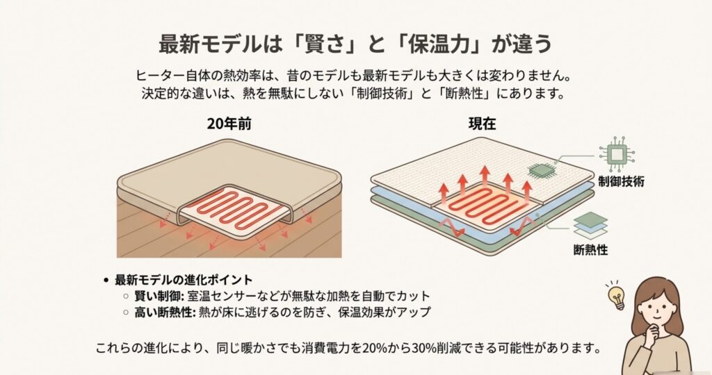 というのも、電気を熱に変えるヒーター線の効率自体は、20年前も今も物理的にほぼ100%で変わっていません。
